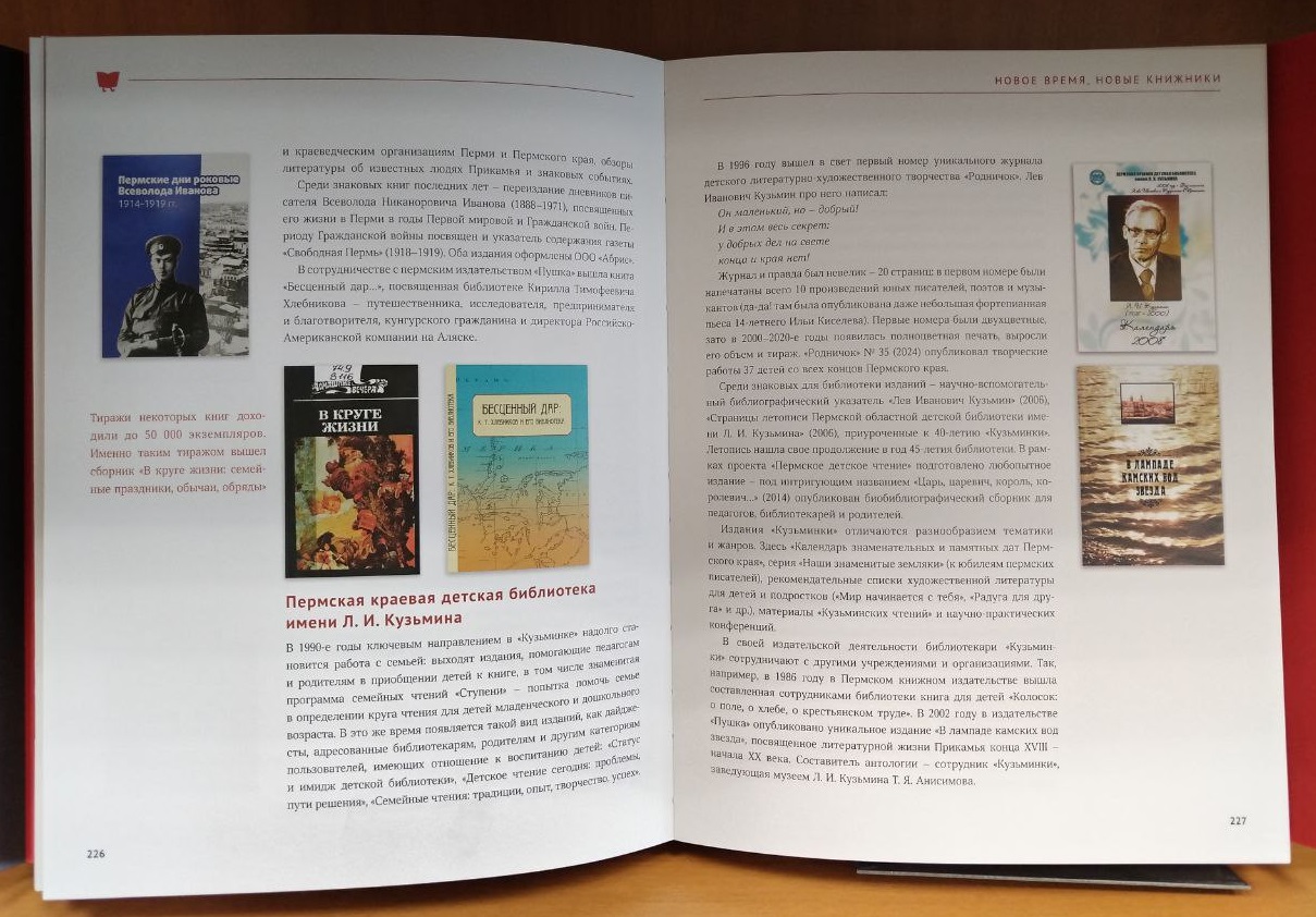 Пермская краевая детская библиотека имени Л.И. Кузьмина внесла свой вклад в создание этой уникальной книги. Наши сотрудники не просто собрали лучшие детские книги пермских писателей – они описали все направления издательской деятельности «Кузьминки»: от первых буклетов и методических изданий до современных библиографических сборников и указателей.